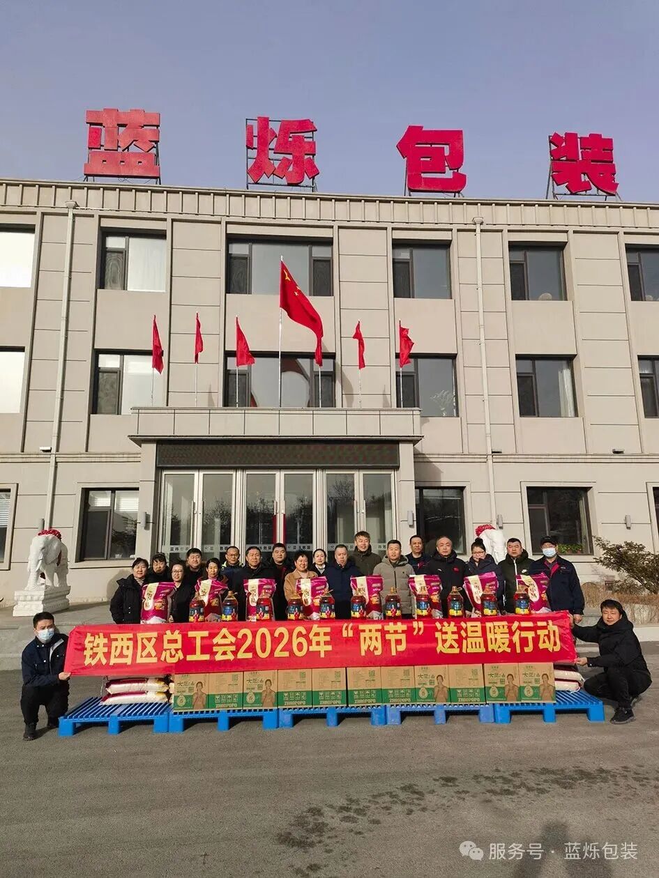 春节将至,岁寒情深。2月5日,铁西区人大常委会副主任、区总工会主席黄跃林,常务副主席李伟一行来到蓝烁包装有限公司,走访慰问春节期间仍将坚守生产一线的员工,为他们送去大米、食用油等慰问品和节日的诚挚祝福。